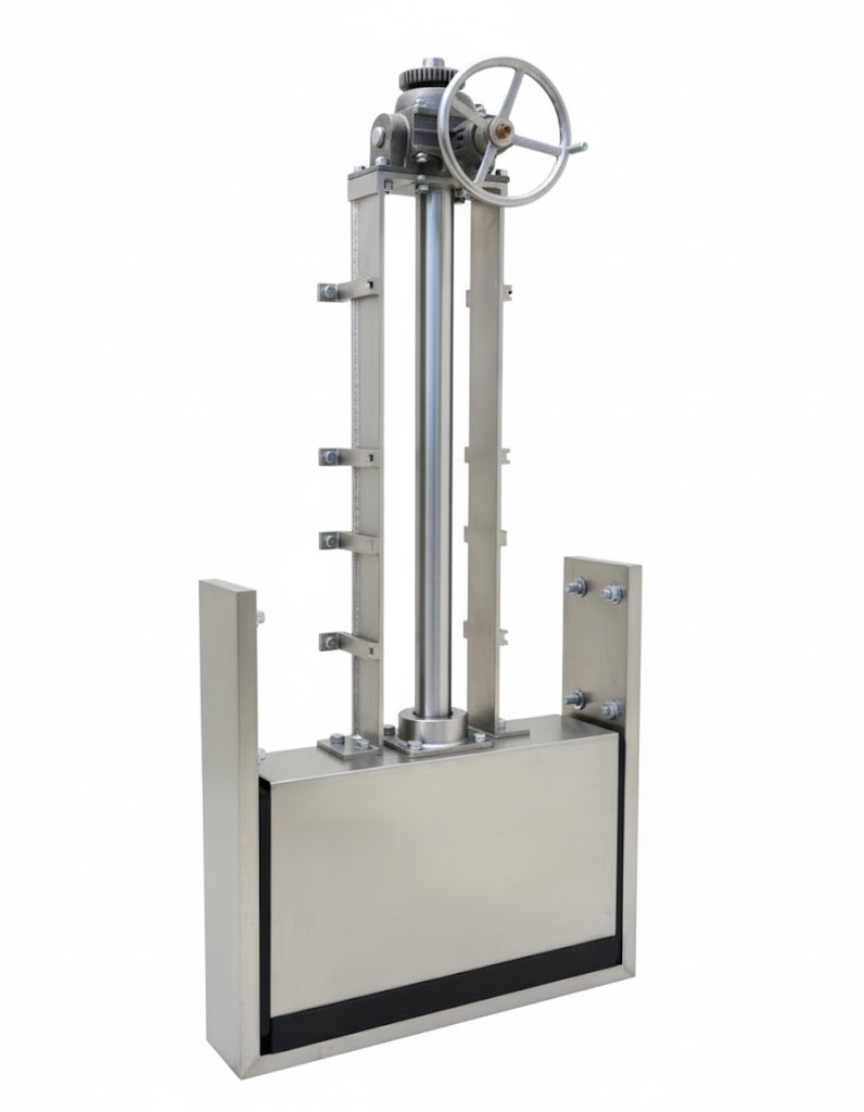 La compuerta tipo guillotina opera mediante un mecanismo vertical con cierre perpendicular al flujo, ofreciendo mayor hermeticidad y menor turbulencia. Es ideal para aplicaciones donde se requiere un sellado preciso y control exacto del caudal.